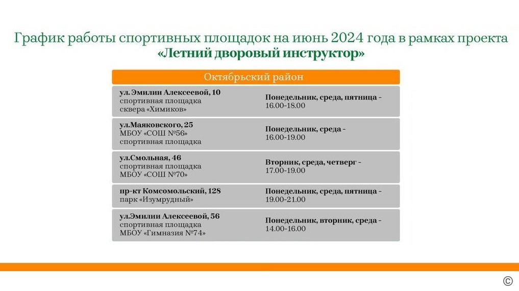 В этом году в рамках проекта в Октябрьском районе будет работать пять спортивных площадок по следующим адресам: ул. Эмилии Алексеевой, 10 (сквер Химиков), ул. Маяковского, 25 (школа №56), ул. Смольная, 46 (школа №70), пр-кт Комсомольский, 128 (парк «Изумрудный»), ул. Эмилии Алексееовй, 56 (гимназия №74).