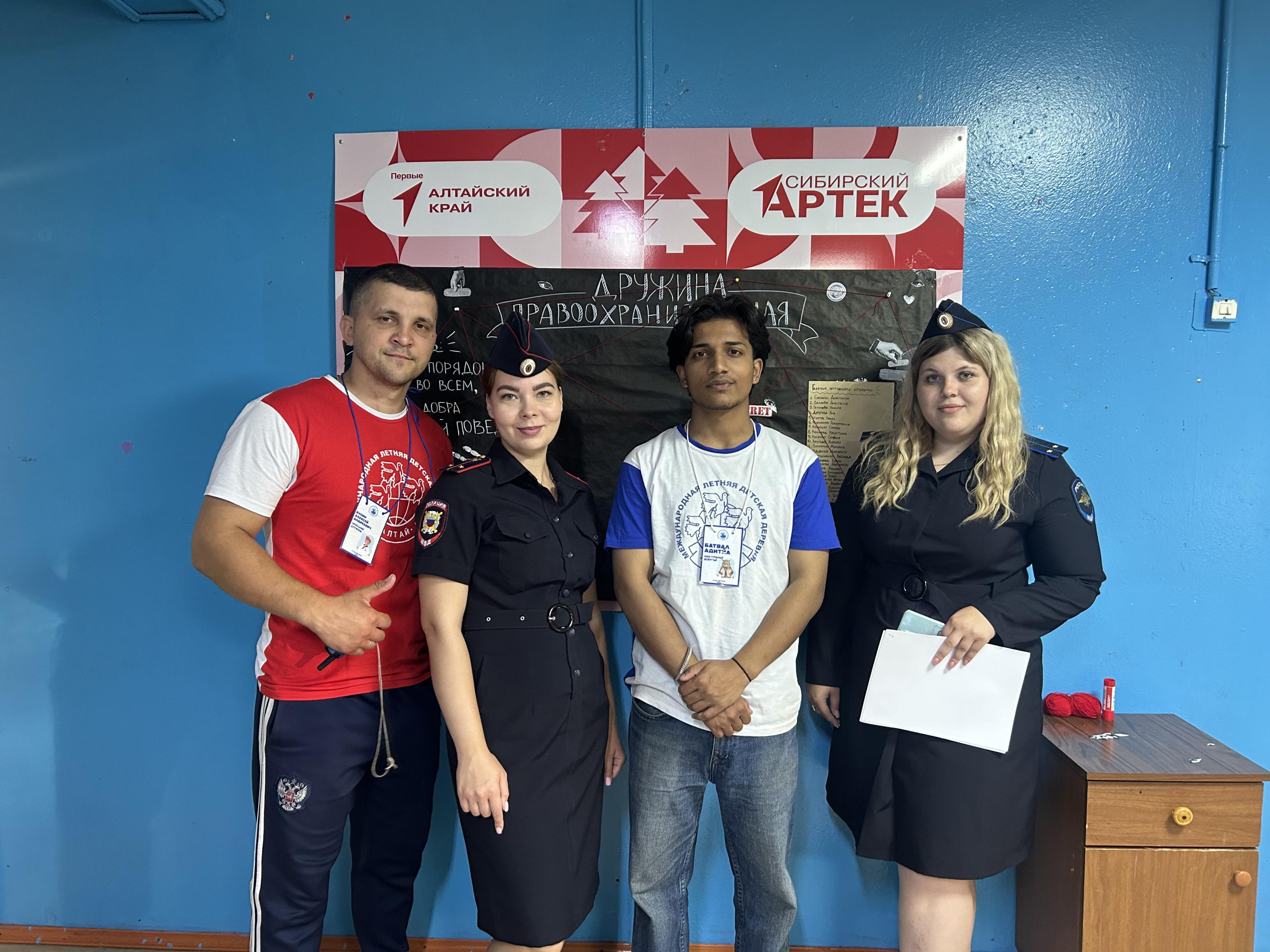 Полицейские посетили дружину «Правоохранительную», в которой состоят ребята из различных районов Алтайского края, включая Рубцовск, Бийск, Барнаул, Первомайский, Поспелихинский, Новоалтайский и другие. Вожатый дружины «Правоохранительной» Батвал Адитйа из Индии обучается на 2 курсе Алтайского государственного медицинского университета и делится своим опытом с детьми.