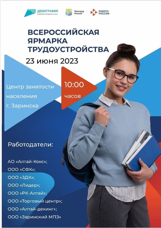 23 июня 2023 года во всех регионах страны пройдет федеральный этап Всероссийской ярмарки трудоустройства "Работа России. Время возможностей". В Заринске мероприятие состоится в центре занятости. Начало — в 10:00.