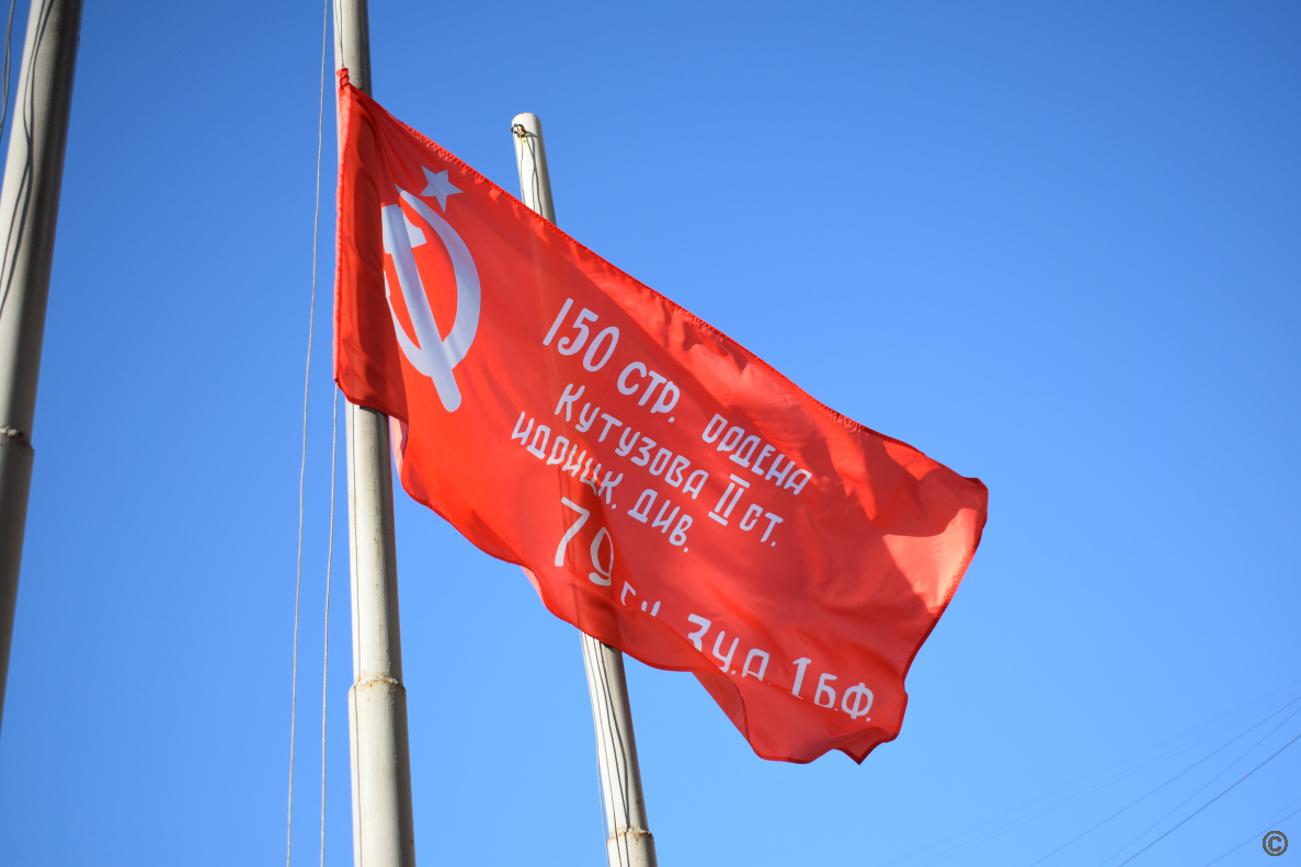 Утром 9 мая на флагштоке у здания администрации Индустриального района в торжественной обстановке поднято Знамя Победы.