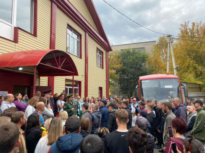 Из сборного пункта в ДК "Октябрьский" отправились первые мобилизованные. Их провожали родные и близкие.