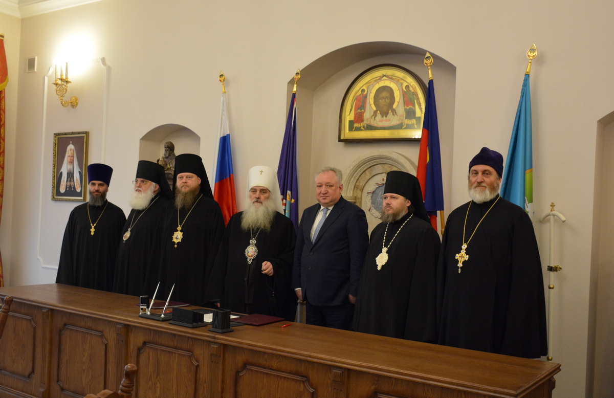 После подписания договора о сотрудничестве Высокопреосвященный Владыка Сергий обратился к присутствующим со словом, в котором подчеркнул безусловную значимость государственной службы для российского государства с учетом особенностей его культурно-исторического развития.