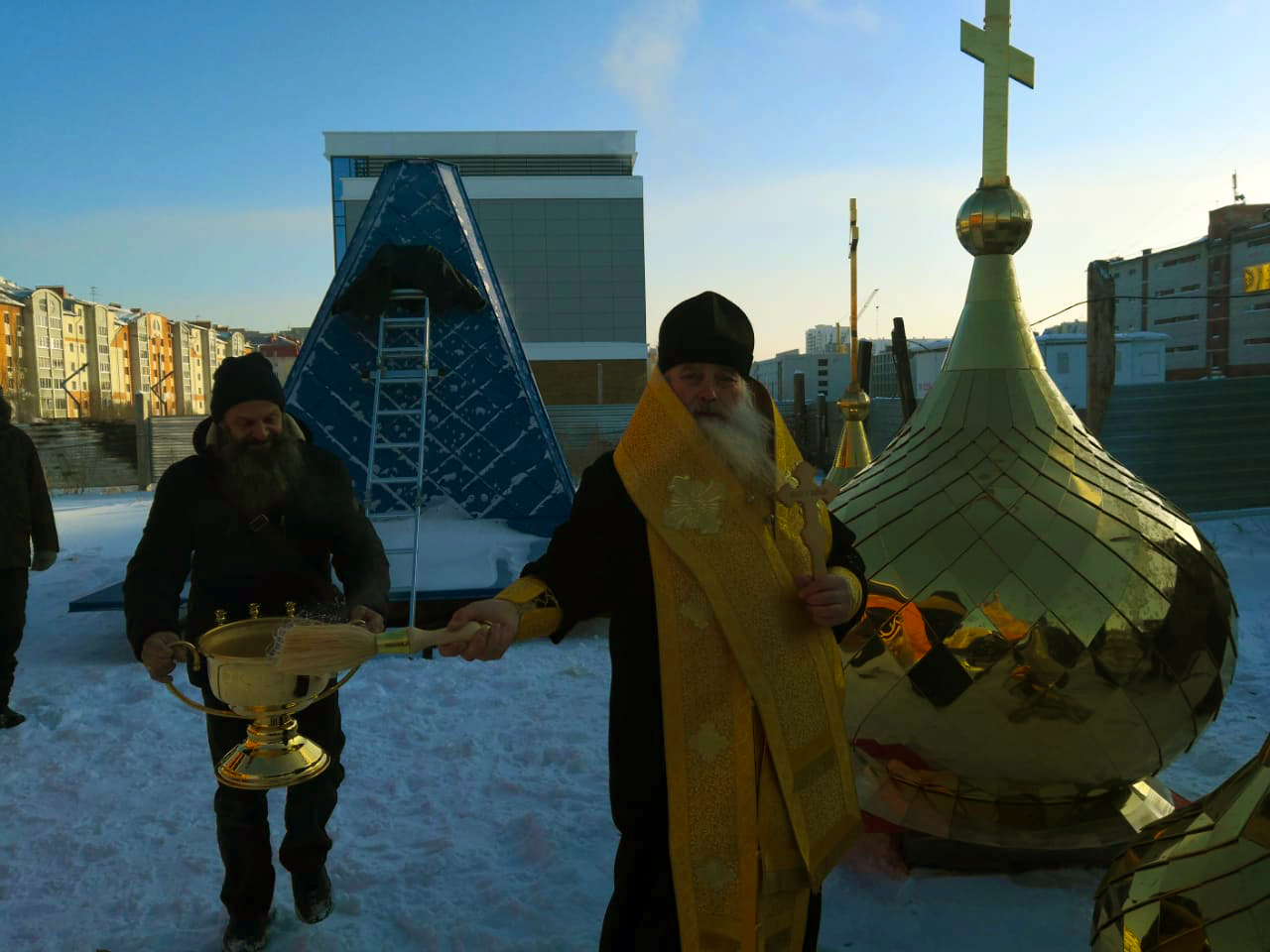 После прочтения молитвы Архипастырь окропил новосооруженные кресты и купола святой водой затем они были воздвигнут над строящимся храмом.