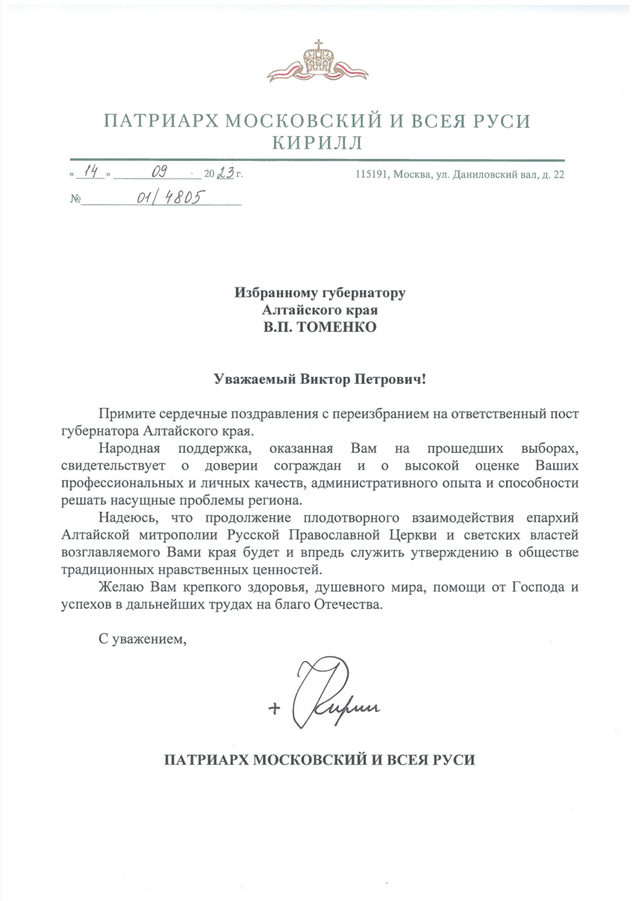 После подведения итогов голосования Святейший Патриарх Московский и всея Руси Кирилл направил поздравление губернатору Алтайского края В.П. Томенко.