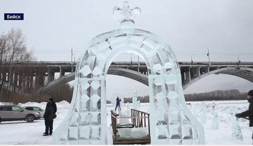 Здесь установили восемь резных деревьев и портал, через который будут проходить гости перед омовением. Специалисты тщательно проверили лёд – толщина больше 55 сантиметров, ходить по нему безопасно. Посетителей Крещенского городка ждёт и совершенно новая скульптура – прорезной крест, такого мастера ещё не делали. Это объёмная трёхметровая скульптура, через центр которой можно увидеть другой берег Бии. Здесь установили и освещение – 50 фонарей. Ансамбль дополнен образом Христа и Деревом православия.