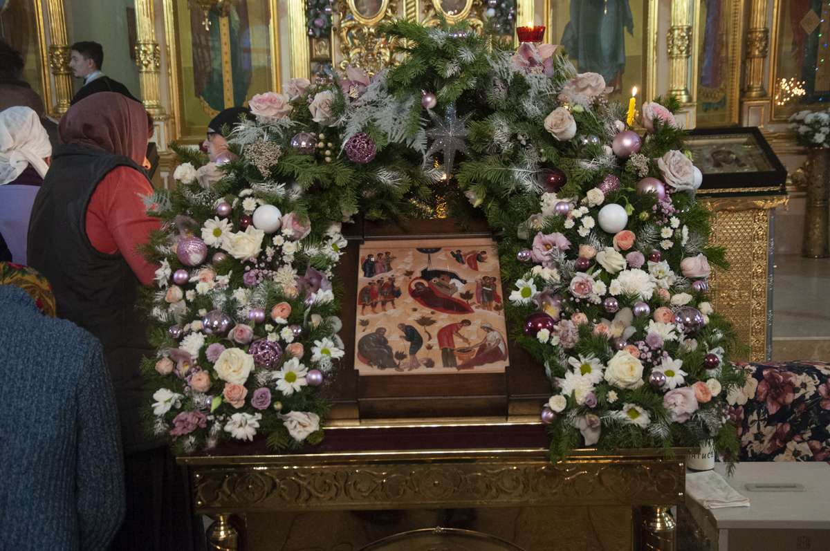 После пения праздничного прокимна Владыка Сергий на кафедре возгласил евангельское зачало, повествующее о событиях священной Рождественской ночи: «Рождество Иисуса Христа было так: по обручении Матери Его Марии с Иосифом, прежде нежели сочетались они, оказалось, что Она имеет во чреве от Духа Святаго. Иосиф же муж Ее, будучи праведен и не желая огласить Ее, хотел тайно отпустить Ее. Но когда он помыслил это,- се, Ангел Господень явился ему во сне и сказал: Иосиф, сын Давидов! не бойся принять Марию, жену твою, ибо родившееся в Ней есть от Духа Святаго; родит же Сына, и наречешь Ему имя Иисус, ибо Он спасет людей Своих от грехов их.