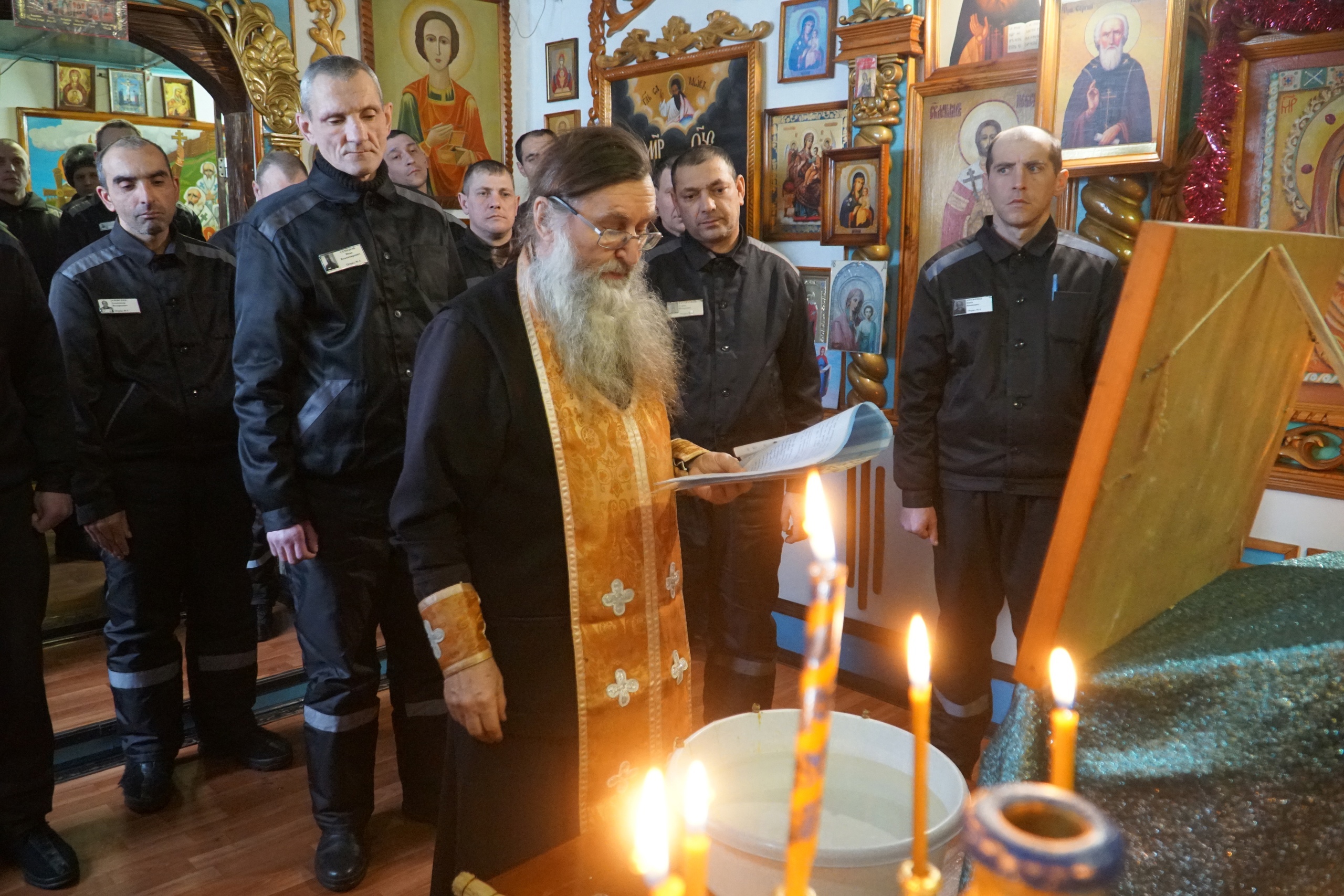 Священники, окормляющие учреждения УИС, провели праздничные службы в храмах при колониях и освятили воду для питья спецконтингента.