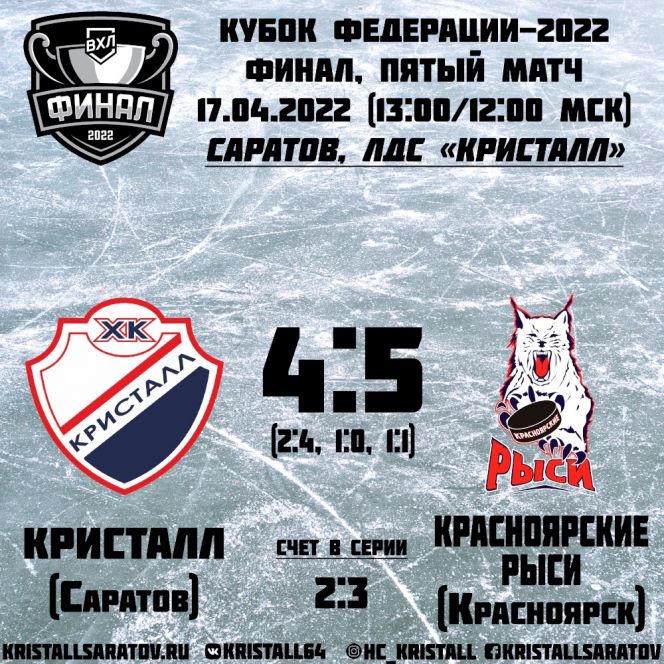 17 апреля в Саратове в пятом финальном матче Кубка Федерации-2022 «Красноярские Рыси» одерживают гостевую победу над «Кристаллом» со счетом 5:4 и выходят вперед 3−2 в серии до четырех побед.
