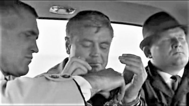 Заключительные кадры «Мертвого сезона»: бугай-охранник (Аскольд Лясота) освобождает от наручников советского полковника-разведчика Ладейникова (Донатас Банионис) - перед его обменом на иностранного шпиона.