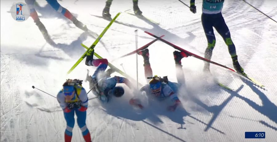 Но, к сожалению, ещё до первой стрельбы Эдуард остался в гонке без главного соперника. С Даниилом случилось настоящая спортивная трагедия. На небольшом спуске перед стрельбищем Серохвостов упал после столкновения с Кириллом Бажиным. Приложились оба спортсмена прилично, но в отличие от Кирилла Даня не смог продолжить гонку, потому что повредил оружие. Так что ему пришлось сняться с дистанции.