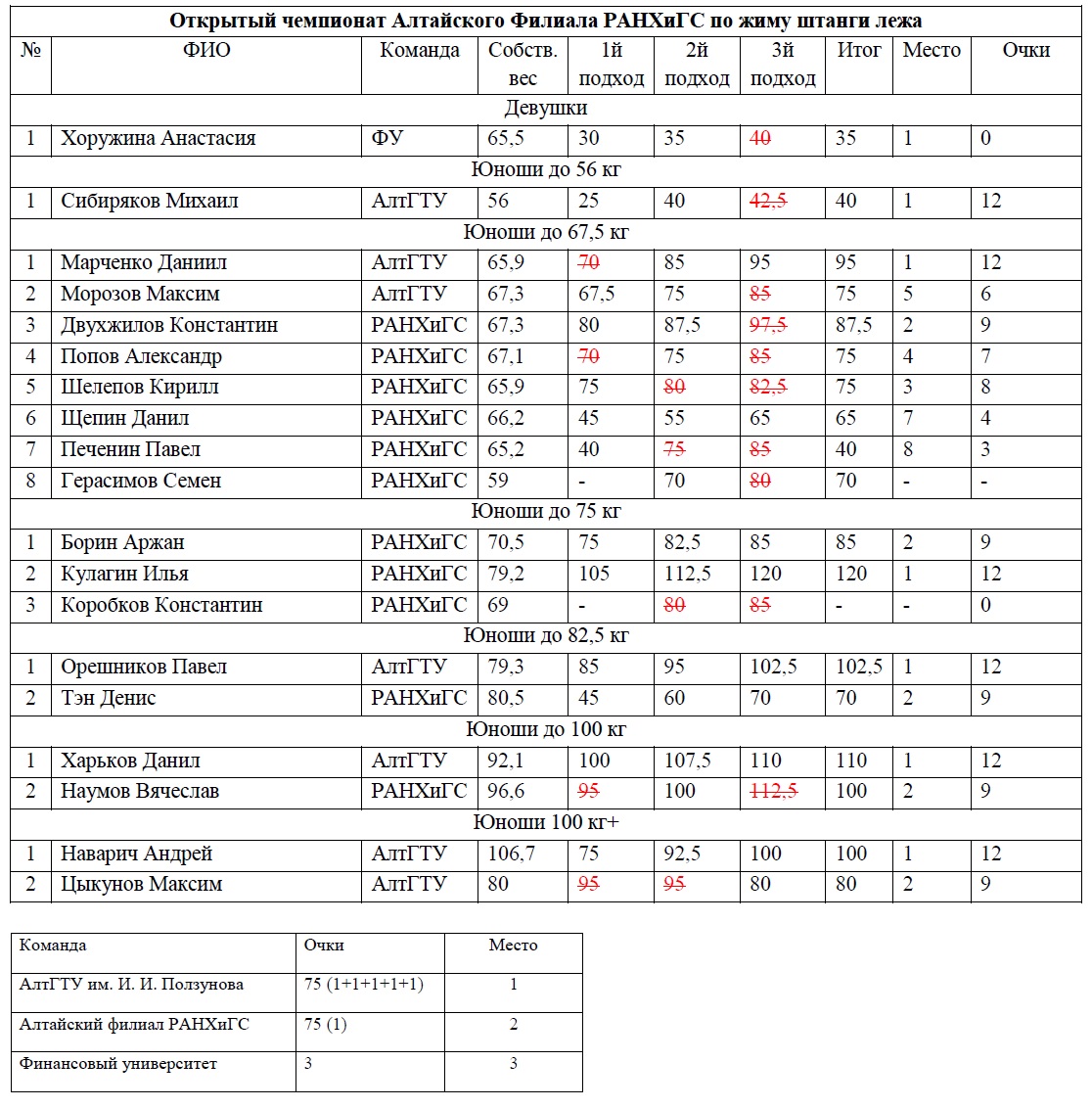 По итогам соревнований команды Алтайского филиала РАНХиГС и АлтГТУ набрали равное количество очков, но политеховцы обыграли по количеству первых мест. Не смотря на то что команда Академии заняла второе общекомандное место, но сильнейшим спортсменом с самым большим жимом лежа в 120 кг оказался студент РАНХиГС – Илья Кулагин , студент 4 курса направления «Юриспруденция», который на протяжении всей учебы занимает только первые места на соревнованиях.