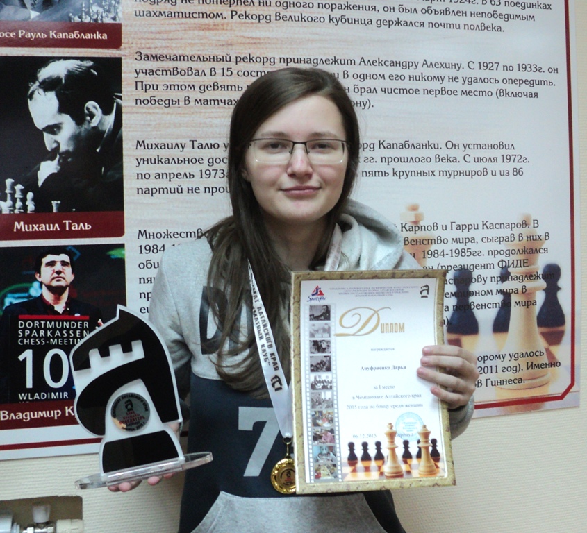 В женском зачете основная борьба за первое место развернулась между мастером ФИДЕ Дарьей Ануфриенко из Барнаула и Алиной Чернокульской из Новосибирской области. Личная встреча лидеров завершилась вничью. В итоге обе шахматистки набрали по 6 очков, но коэффициент оказался выше у Чернокульской. Третье место заняла еще одна представительница Новосибирска Елизавета Тумашевич. Поздравляем Дашу Ануфриенко с возвращением к классическим шахматам после долгого перерыва в своей карьере.