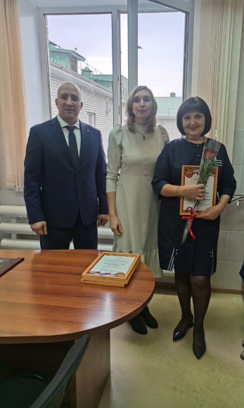 И. о. главного врача КГБУЗ "Алейская ЦРБ" Захаров Вячеслав Юрьевич вместе с заместителем главы города Алейска Степановой Ольгой Николаевной, чествовали отличившихся в профессиональной деятельности работников.