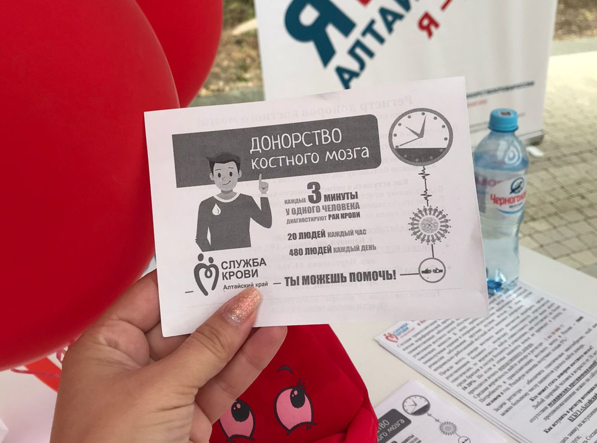 Акция состоится 8 сентября с 10:00 до 14:00 по адресу: г. Барнаул, пл. Сахарова (напротив «Титов-Арена», пр. Социалистический, 93). Внесите себя в списки потенциальных доноров костного мозга в мобильной станции переливания крови!