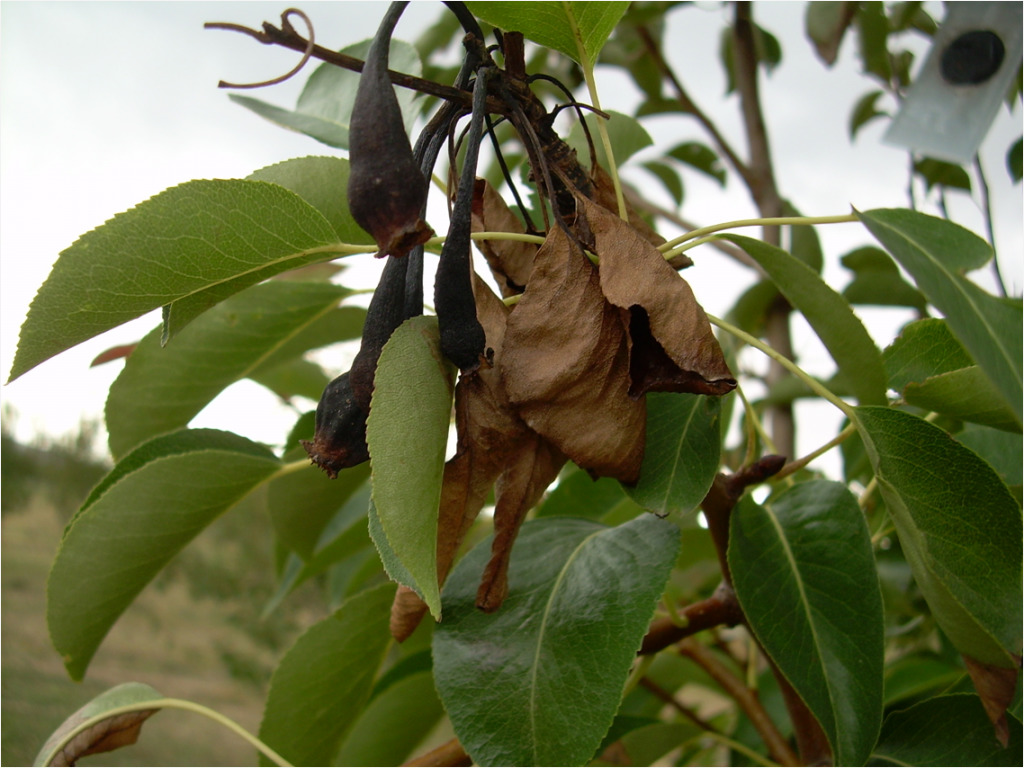 Все надземные части растения хозяина могут поражаться возбудителем бактериоза. Прежде всего, болезнь можно обнаружить на цветках – они становятся темно-коричневыми и постепенно опадают. Веточки и молодые побеги покрываются водянистыми темными пятнами, их кончики чернеют (будто опаленные) и загибаются. Листья груши чернеют, а яблони – буреют от кончиков к основанию, скручиваются и висят как обгоревшие.