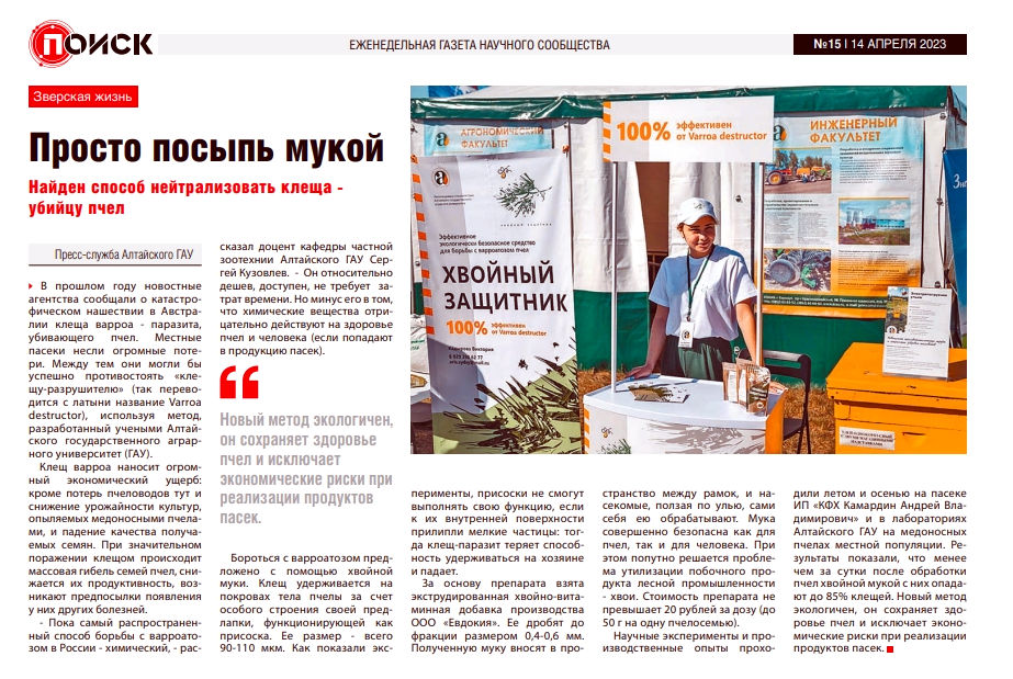 Федеральная газета научного сообщества "Поиск" в №14 (1765) от 14 апреля 2023 г. (С. 16) опубликовала статью под названием "Просто посыпь мукой", посвященную уникальной разработке ученых Алтайского государственного аграрного университета - доцента кафедры частной зоотехнии Сергея Валентиновича Кузовлева и магистранта Виктории Кадыровой - хвойной муке для борьбы с варроатозом пчел. Материал также продублирован на интернет сайте газеты "Поиск".