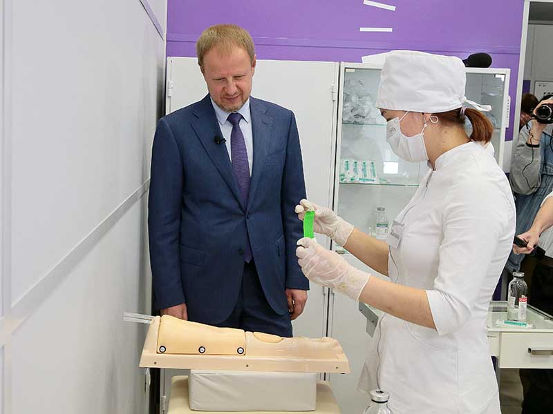 Губернатор Виктор Томенко осмотрел ФАП на территории колледжа, принял участие в “тестовом” первичном приеме пациента: запись в АРМ-поликлинике, пульсоксиметрия, измерение давления под наблюдением студента-медика. Затем он осмотрел кабинета домашнего ухода, кабинет функциональной диагностики, операционную, палату стационара и кабинет психоэмоциональной разгрузки. Все это — учебные помещения, где будущие медики отрабатывают полученные во время учебы навыки. В колледже оборудованы условия, максимально приближенные к реальной работе медиком. Директор колледжа поблагодарила губернатора за поддержку, благодаря которой удалось оборудовать учебное заведение и сделать ремонт в общежитиях. Также он поговорил со студентами о том, где они планируют в будущем работать.