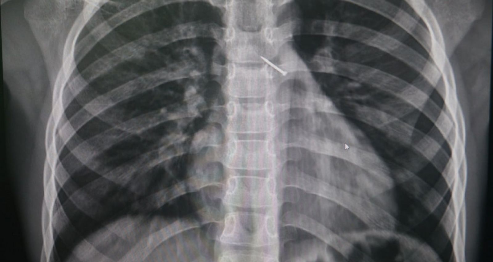 Выяснилось, что во время активной игры на улице ребенок случайно вдохнул острый предмет. В больницу мальчик поступил с болью за грудиной и невозможностью глубоко вдохнуть. Рентген показал, что канцелярская кнопка попала в бронхи, уперлась в одну из стенок и вызывала воспаление.