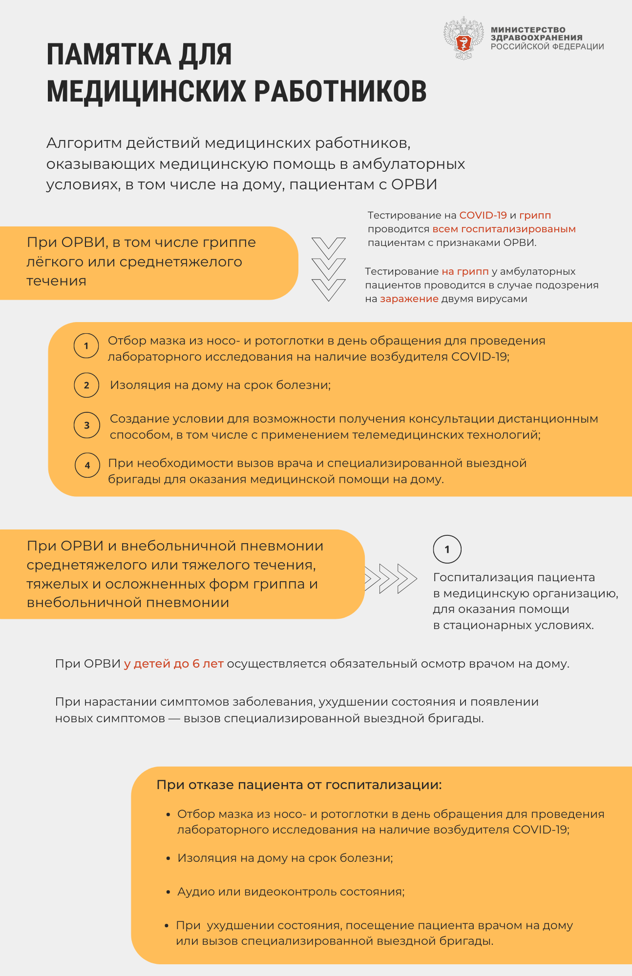 Минздрав России разработал памятку для медицинских работников по проведению дифференциальной диагностики острых респираторных вирусных инфекций для своевременного назначения лечения пациентов.Руководство по определению тактики ведения пациентов дополнительно включает рекомендации по лечению детей, лиц пожилого возраста и беременных. Алгоритм действий разработан для медицинских работников, оказывающих медицинскую помощь в амбулаторных условиях, в том числе на дому.